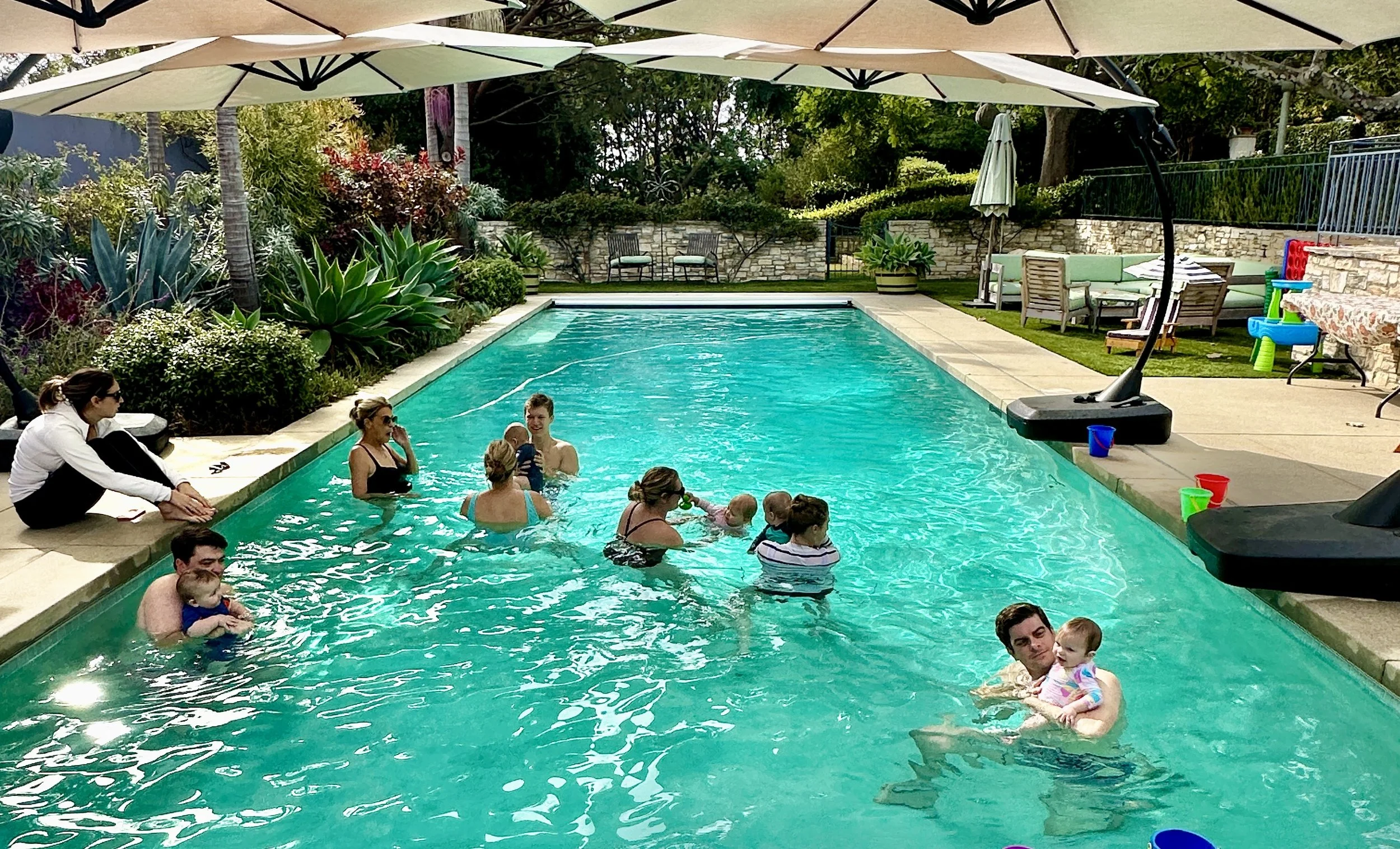Our private pool in Pacific Palisades has been completely drained, re-plastered and upgraded to salt water after the recent devastation of the fires. The pool will be heated to 85 degrees for each class. Please remember to bring a swim suit and towel for both you and your little one, swim diapers, any sunscreen, snacks, milk/water needed, as well as a change of clothes for afterwards. The pool will be partially shaded.